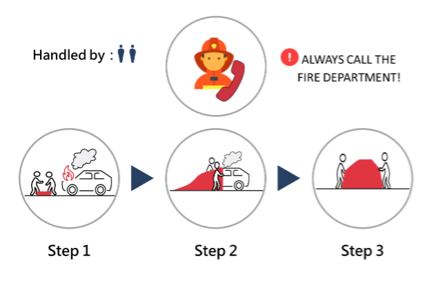 Step 2:Two people should grab each their handle and safely pull the fire blanket over the car in one continuous movement.